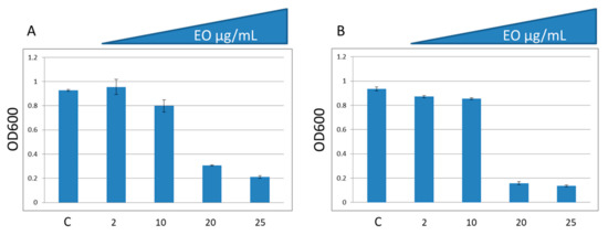 Effect of EO on growth of two MDR S. aureus isolates (A—S. aureus strain 11; B—S. aureus strain 5). Data are average from triplicate experiments. Bars represent standard deviations of triplicate incubations.