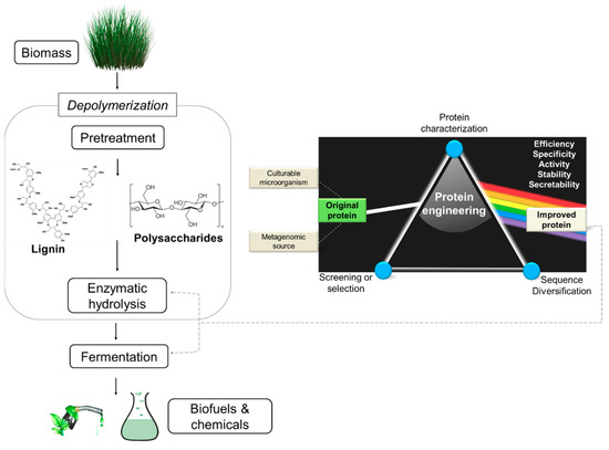 On the other hand, the third and most recent wave started with the development of technologies to engineer an enzyme genetically (termed hereafter simply as “protein engineering”). The engineering can be performed through two main approaches, comprising directed evolution and rational design [13,14]. Directed evolution simulates, in a faster way, the natural selection process. In this approach, the protein coding sequence is altered—via creation of mutations, insertions, deletions, recombination, duplications, etc.—generating a group of different proteins; then, these variants are screened for one or more improved traits [15]. Rational design uses prior knowledge on protein structure and computational tools in order to deliberately design novel proteins [16]. Both protein engineering approaches—directed evolution and rational design—are applied to improve protein properties of the enzymes involved in depolymerization and fermentation of the lignocellulosic material to produce biofuels or fine chemicals (Figure 1).
