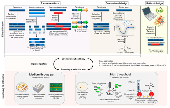 Diversification can be achieved through non-recombinant or recombinant methodologies. These methods can be divided into two approaches, random or semi-rational. The most common method to generate random mutagenesis is error-prone PCR (epPCR) [24,25]. However, other (non-physical/chemical) methods also became more popular such as error-prone rolling circle amplification (epRCA) [26], sequence saturation mutagenesis (SeSaM) [27], and mutator strains (e.g., phage-assisted continuous evolution (PACE) [28] or XL1-red Escherichia coli [29]).