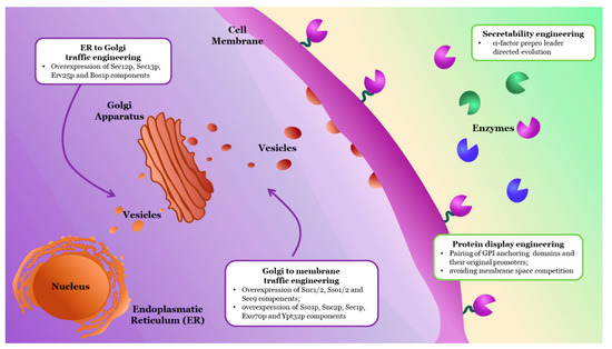 Tang et al. assessed the effect of engineering vesicle trafficking components in extracellular secretion and surface display of an endoglucanase (CelA) and a β-glucosidase (BGL1) [132]. Overexpression of vesicle trafficking components Sec12p, Sec13p, Erv25p, and Bos1p, involved in trafficking from the endoplasmic reticulum to Golgi, improved the secretion of both enzymes in different levels, showing a protein-specific effect of these transport pathways similar to that observed by van Zyl et al. [131]. However, even though overexpression of protein transport components from Golgi to the plasma membrane was more effective for BGL1 secretion, it was suggested for the first time that vesicle engineering could be a viable approach not only for secretion but also for cell-wall surface display of heterologous enzymes, given that they successfully obtained CelA and BGL1 fused to surface-anchored protein α-agglutinin.