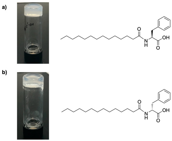 (a) Aliphatic-amino acid hydrogel shown through an inverted vial test and the molecular structure of MA-l-Phe-OH; and (b) aliphatic-amino acid hydrogel shown through an inverted vial test and the molecular structure of MA-d-Phe-OH.