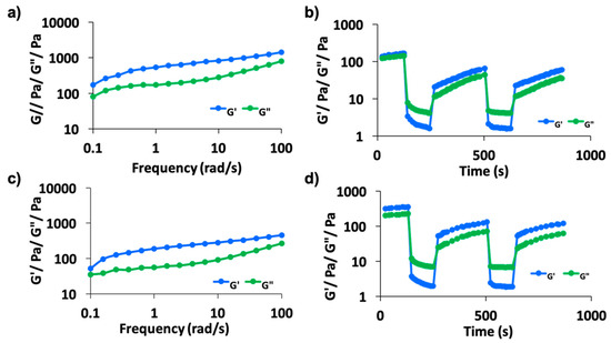 Step-strain experiments using the rheometer demonstrating thixotropic properties were also performed in which strain was applied to the gel causing the gel to revert to the solution phase. Thixotropic properties of the gel demonstrate that under normal conditions, the property is a gel and under stressed conditions such as heat, force, or sonication, it becomes less viscous, however, when the stress is removed the gel-state reforms. Self-healing gels that can restore their functionalities and structures after damage have been developed as ‘smart’ soft materials [38]. Rheological studies show the behavior of the gel under mechanical stress and the variation of the storage and loss modulus have been studied under the application and release of shear stress. Stress causes the gel to break, while release of the mechanical stress allows reformation of the hydrogel [39]. In the first cycle in which 0.1% strain was applied, G′ is greater than G″ confirming gel formation, whereas in cycle 2, 100% strain is applied and G″ is found to be greater than G′, thus reverting it to sol state. Strain was removed and set back to 0.1% in the third and fifth cycles to see if the gel reformed, interestingly, both compounds exhibited thixotropic properties shown in Figure 2b,d.