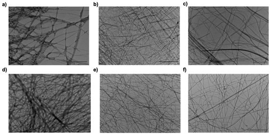 TEM images of MA-l-Phe-OH and MA-d-Phe-OH. (a–c) Three-dimensional fibrous network of MA-l-Phe-OH, and (d–f) three-dimensional fibrous network of MA-d-Phe-OH. The scale bar is 2 μm for all images except (b), which is 5 μm.