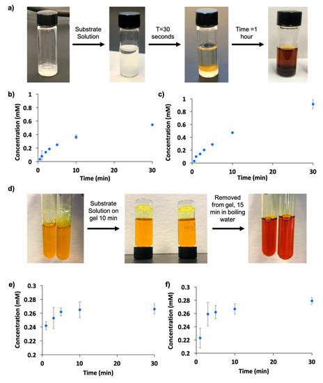 The substrate solution containing 2.6 mL of 50 mM monobasic phosphate buffer pH 7, 0.16 mL of a 30% H2O2 solution, and 0.32 mL of a 50 mg/mL pyrogallol solution was added on top of the enzyme-entrapped hydrogel. Within seconds, a color change was observed in the substrate solution indicating the formation of product, purpurogallin, which could be quantified using ultraviolet (UV) spectroscopy at 420 nm and its extinction coefficient of 2640 M−1 cm−1 in 50 mM phosphate buffer at pH 7. In Figure 5a, the color change of the substrate solution after 30 s was observed, indicating that the enzyme was very active in our hydrogel. The color change was first noticed at the surface of the gel and as time increases the color change throughout the whole gel was observed. This is due to the initial contact of the substrate and enzyme on the hydrogel surface, however as the substrate diffused in the gel and reacted with more enzyme, more product was formed causing the full gel to turn the brown color as seen in Figure 5a after one hour. The formation of product was then quantified over a period of time as shown in Figure 5b,c. It is observed that as time increases, giving the substrate time to diffuse into the gel and react with the entrapped enzyme, the formation of product also increased. This follows a similar trend to the enzyme in solution, where as time increased, product formation also increased. However, due to the instant and direct contact of the enzyme with the substrate in solution, product formation plateaus much quicker. The activity of the enzyme in solution can be found in Figure S12.