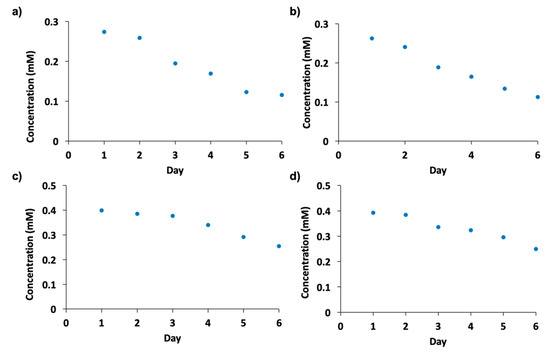 Reported advantages of enzyme entrapment in amino acid and peptide hydrogels are to increase its stability over longer periods and to be able to reuse and recycle the same enzyme for many catalytic reactions [26]. A recycling experiment was performed where the enzyme-entrapped hydrogels catalyzed a fresh substrate solution every day for one week. Each day the substrate solution was removed, and a fresh solution was placed on top of the hydrogel to see if the enzymes were still active and could catalyze multiple reactions over the one-week period of time. Figure 6a–d shows the activity after 10 min in the enzyme-entrapped hydrogels every day over a one-week period. Over time less product was produced, which was expected; however, the enzyme was able to remain active and be re-used multiple times in the hydrogel. Here, the same entrapped enzyme was able to catalyze multiple catalytic reactions without the usual requirement of a new catalyst each day.