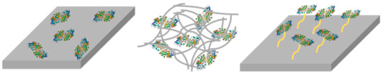 The three enzyme immobilization methods; adsorption, entrapment, and covalent bonding (from left to right).