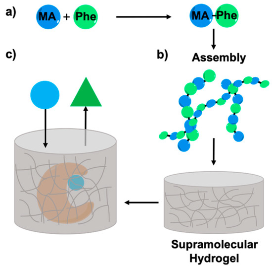 Scheme summarizing the overall research work. (a) Synthesis of amino acid conjugates using Myristic acid (MA) and Phenylalanine (Phe); (b) formation of hydrogel through supramolecular assembly of amino acid conjugates; (c) enzyme entrapped in supramolecular hydrogel, substrate (blue circle) diffusing in and product (green triangle) diffusing out.