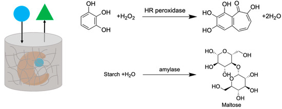 Enzyme reaction schemes of horseradish peroxidase (HRP) and amylase enzymes. HRP converts pyrogallol (substrate) to purpurogallin (product) and amylase converts starch (substrate) to maltose (product).