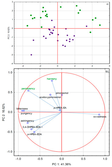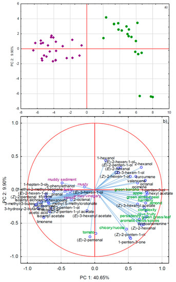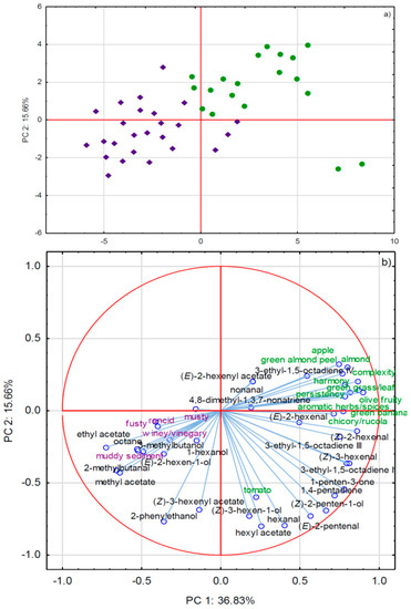 - Lukić, I.; Carlin, S.; Horvat, I.; Vrhovsek, U. Combined targeted and untargeted profiling of volatile aroma compounds with comprehensive two-dimensional gas chromatography for differentiation of virgin olive oils according to variety and geographical origin. Food Chem. 2019, 270, 403–414. [Google Scholar] [CrossRef]