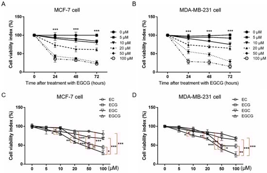 (−)-Epigallocatechin-3-gallate (EGCG) inhibits cell viability of breast cancer cells. (A) Cell viability of the MCF-7 cell line treated with various EGCG doses for 24, 48, and 72 h. (B) Cell viability of the MDA-MB-231 cell line treated with various EGCG doses for 24, 48, and 72 h. We compared the cell viabilities of MCF-7 or MDA-MB-231 cells treated with various EGCG concentrations at 24, 48, and 72 h (one-way ANOVA; *** p < 0.001). (C) Cell viability of MCF-7 treated with various concentrations of EC, epicatechin; ECG, epicatechin gallate; EGC, epigallocatechin; and EGCG for 24 h. (D) Cell viability of MDA-MB-231 treated with various concentrations of EC, ECG, EGC, and EGCG for 24 h. We compared the cell viabilities of MCF-7 or MDA-MB-231 cells treated with EC, ECG, EGC, and EGCG (one-way ANOVA followed by Dunn’s multiple comparison post hoc test; * p < 0.05, ** p < 0.01, and *** p < 0.001 the EC, ECG, EGC group versus EGCG group, respectively). Data were presented as mean ± SEM from six independent experiments.