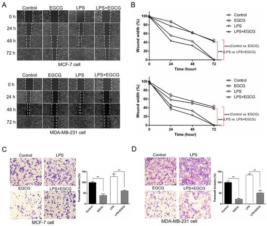 Given the significance of cell migration and invasion in regulating the process of forming distant metastasis, and a previous study suggesting that LPS (5 μg/mL) could trigger the action [19], we investigated the effect of EGCG on LPS-induced cell morphology changes of human breast cancer cells by the means of in vitro scratch wound healing and Transwell assays. MCF-7 and MDA-MB-231 cells were treated with EGCG, LPS, and LPS plus EGCG for 0~72 h. Results of the wound healing assay are shown in Figure 2A,B. The width ratios of cell-free areas were significantly higher in EGCG-treated MCF-7 cells compared with the control group at 24, 48, and 72 h (p < 0.001). Moreover, the combined treatment with LPS and EGCG demonstrated interactional antimigratory function compared to LPS-treated cells (p < 0.001). In addition, 42.2% and 38.8% wound width were still observed in MDA-MB-231 cells treated with EGCG or a combination of LPS plus EGCG for 72 h after scratching, respectively (Figure 2A,B). The Transwell assay also indicated that the number of invasive MCF-7 and MDA-MB-231 cells treated with EGCG or combined LPS and EGCG was significantly reduced compared to the untreated or LPS-treated cells (Figure 2C,D) (p < 0.01). These in vitro findings illustrated that EGCG can inhibit the migration and invasion of breast cancer cells.