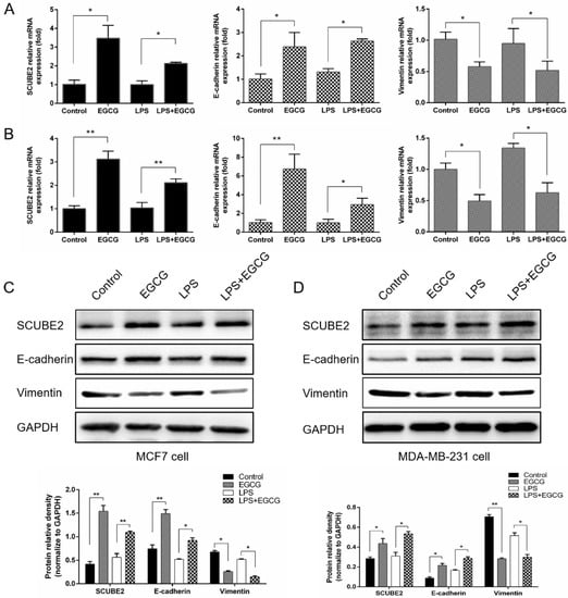 Effects of EGCG on the expression of SCUBE2, E-cadherin, and vimentin. MCF-7 and MDA-MB-231 cells were treated with EGCG (20 μM), LPS (1 μg/mL), and combined EGCG and LPS. The mRNA expression was determined by real-time PCR (A,B), and the protein levels were determined by Western blot (C,D). Statistical significance was determined by one-way ANOVA (* p < 0.05, ** p < 0.01). Densitometry analysis of relative SCUBE2, E-cadherin, and vimentin protein levels compared with glyceraldehyde 3-phosphate dehydrogenase (GAPDH) was performed by ImageJ 1.44 software. Data are shown as mean ± SEM from three independent experiments.