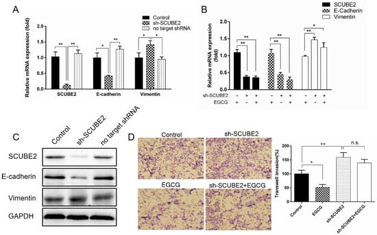 SCUBE2 silencing affected the gene expression and cell invasion in MCF-7 cells. (A) The mRNA expressions of SCUBE2, E-cadherin, and vimentin were detected in the SCUBE2 silencing cells (one-way ANOVA; * p < 0.05, ** p < 0.01 vs. sh-SCUBE2 group). (B) The mRNA expressions of SCUBE2, E-cadherin, and vimentin were detected in the SCUBE2 silencing cells that were treated with EGCG (one-way ANOVA; * p < 0.05, ** p < 0.01 vs. EGCG treatment group). (C) The protein levels of SCUBE2, E-cadherin, and vimentin were detected in the SCUBE2 silencing cells. (D) Cell invasion was detected in the SCUBE2 silencing cells that were treated with EGCG (one-way ANOVA; * p < 0.05, ** p < 0.01 vs. control). Scale bars, 50 μm. Data are expressed as mean ± SEM of three independent experiments. n.s. represents no significance.