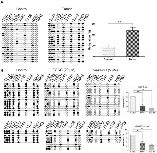 EGCG reduced the DNA methylation of the SCUBE2 gene. (A) The SCUBE2 methylation status in breast tumor tissue and adjacent control (Student’s t-test; ** p < 0.01 vs. control). (B) The methylation of the SCUBE2 gene in MCF-7 (upper panel) and MDA-MB-231 cells (lower panel) treated with EGCG (one-way ANOVA; * p < 0.05, ** p < 0.01 vs. control). Data are shown as mean ± SEM from three independent experiments.