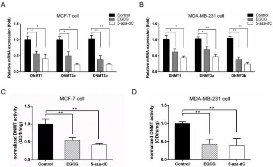 EGCG treatment decreased DNA methyltransferase (DNMT) expression and activity in breast cancer cells. The mRNA level of DNMT1, DNMT3a, and DNMT3b in MCF-7 (A) and MDA-MB-231 cells (B) treated with 20 μM EGCG or 5 μM 5-aza-dC. The results are presented as the expression of the individual mRNA with normalization to GAPDH (one-way ANOVA; * p < 0.05, ** p < 0.01 vs. control). (C) Normalized DNMT activity following 20 μM EGCG or 5 μM 5-aza-dC treatment in MCF-7 cells. (D) Normalized DNMT activity following 20 μM EGCG or 5 μM 5-aza-dC treatment in MDA-MB-231 cells. DNMT activity was significantly decreased with EGCG or 5-aza-dC treatment. The data (C,D) are normalized to the average values of control, untreated samples run within the same experiment, thus data were expressed relative to 1 (control) (one-way ANOVA; * p < 0.05, ** p < 0.01 vs. control). Data are expressed as mean ± SEM of three independent experiments.