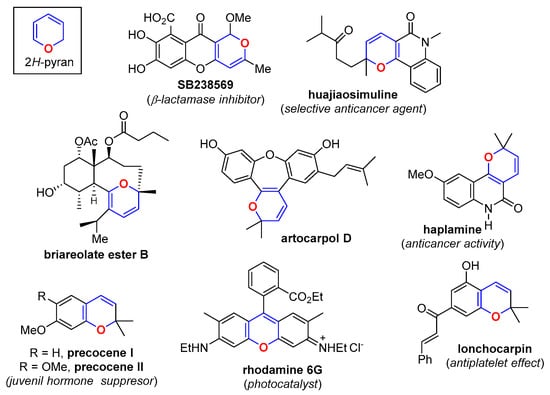 The 2H-pyran (2HP) ring constitutes a structural motif present in many natural products (Figure 1) [1] and is a strategic key intermediate in the construction of many of these structures [2,3]. In spite of their importance, the literature of 2HPs is relatively scarce [4,5,6,7,8,9], mainly due to the instability associated with the heterocyclic ring, which makes these heterocycles establish an equilibrium with their opened isomeric forms (Scheme 1). Fusion of a 2HP to an aromatic ring confers stability to these heterocycles. Thus, while simple 2HPs are difficult to synthesize as pure and isolated compounds, many of their benzo derivatives (i.e., 2H-chromenes) constitute stable molecules, with a broad spectrum of biological activities and a widespread representation in the higher plants (Figure 1). Because the chemistry and reactivity of 2H-chromenes have been already previously revised [1,10,11,12,13,14,15], they will not be included in this review. Instead, we will focus on the recent advances on accessing 2HPs, either as simple and stable monocyclic structures or as part of fused polycyclic structures, excluding the 2H-chromene system.