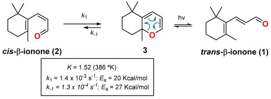 Although this valence isomerization was invoked to explain some enigmatic results found in earlier examples with these molecules, the first clear-cut example of it came from the irradiation of trans-β-ionone (1) (Scheme 2) [18]. Authors found that the irradiation afforded a mixture of cis-β-ionone (2) and 2HP 3, with a value for the equilibrium constant K = 4.61 at 327 °K (K = 1.52 at 386 °K), and values for k1 = 1.4 × 10−3·s−1 and k−1 = 1.3 × 10−4·s−1. In addition, measurements at different temperatures gave activation energies (Ea) of 20 Kcal/mol for the cis-dienone to 2HP reaction, and 27 Kcal/mol for the reverse process [19].