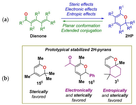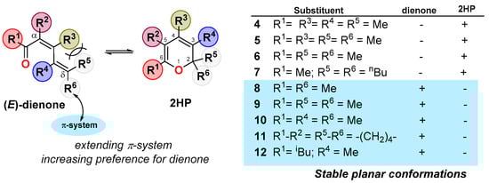 Further studies on the conformation of conjugated dienones allowed the establishment of some general patterns for these dienone/2HP equilibria (Scheme 3) [20]. It was observed that steric destabilization of the dienones shifted the equilibria toward the 2HPs. This was the case for tetrasubstituted dienones 4 and 5, which fully isomerized to the corresponding 2HPs. On the other hand, simpler dienones 8–12, which could adopt a stable planar conformation, existed in the opened form. Likewise, trisubstituted dienones 6–7, which are representative examples of dienones featuring non-stable planar conformations, preferred their closed forms. Along with these results, the authors also observed that the substitution of a δ-alkyl substituent (R5 or R6) by a substituent able to extend the conjugation of the π-system (e.g, vinyl group) favored the dienone form (Scheme 3). A main conclusion from these and other studies [20,21] is that the existence of the 2HP form depends primarily on the steric destabilization of the dienone rather than on its specific substitution pattern. Thus, the design of stable 2HPs must include, among other structural/electronic criteria, enough steric destabilization on the dienone to penalize the valence isomerization.