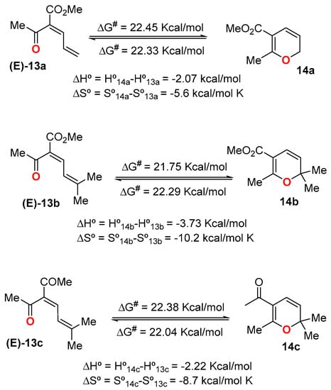 With regard to thermodynamic parameters of some of these equilibria (Scheme 5), Krasnaya et al. found that, in all cases, the enthalpies of the α-acyl-dienones 13 were appreciably higher than those of 5-acyl-2HPs 14, which is in full agreement with the observed increase in the dienone content with the increase in temperature. As should be expected, the entropy contents were also higher for the closed structures. In all the investigated cases, ΔG# values were on the order of 21.88 Kcal/mol to 22.86 Kcal/mol.