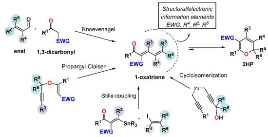 The most common route for synthesizing these heterocycles relies on the oxa-6π-electrocyclization of dienones, the so-called 1-oxatriene pathway [28]. As already discussed in the previous section, this methodology requires endowing the 1-oxatriene unit with structural or electronic information, or both, to shift the valence equilibrium toward the 2HP form (Scheme 7). Thus, different synthetic pathways to the 1-oxatriene core have been successfully explored, involving, among others, the classic Knoevenagel condensation between active methylene compounds and α, β-unsaturated aldehydes (enals), Claisen rearrangements of propargyl vinyl ethers, Stille coupling of vinyl stannanes and vinyl iodides, and cycloisomerization of dienols (Scheme 7).