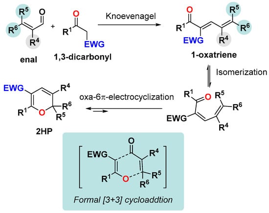 The Knoevenagel condensation constitutes the most common access to 1-oxatrienes, and most generally involves the reaction of an enal with a 1,3-dicarbonyl compound [29]. The sequential performance of the Knoevenagel condensation and the electrocyclization reaction generates 2HPs (Scheme 8). From a synthetic point of view, the whole tandem process can be considered a formal [3 + 3] cycloaddition [2,28]. There is a plethora of examples of this strategy in the literature, mainly in the field of total synthesis of natural products. In this review, we will pay attention exclusively to established synthetic methods that allow or have allowed general access to these heterocycles. Specific cases utilized to access a particular structure or a specific natural product will not be covered. We refer the reader to the excellent published reviews covering this issue [2,3].