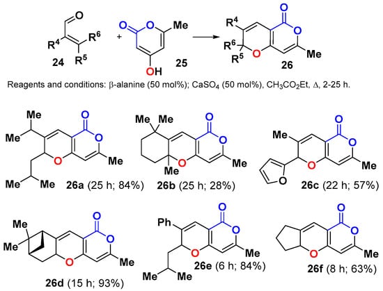 The iminium-mediated Knoevenagel condensation (IMKC) [31,32] has been currently used to condense 1,3-dicarbonyl (active methylene) compounds with 2-alkenyliminiums (activated enals), and it constitutes a very versatile route to 1-oxatrienes [2,33]. The chemical outcome of the reaction is that of a formal [3 + 3] cycloaddition between enols and enals (see Scheme 8). The reaction is productive when functionalized cyclohexane-1,3-diones (e.g., 21) (Scheme 10) or 4-hydroxypyrones 25 (Scheme 11) are used as the active methylene compounds in the process. In this manner, 2HPs 23a–g were synthesized from the functionalized cyclohexa-1,3-dione 21 and different functionalized enals 22 (Scheme 10) [34]. These 2HPs were used as key intermediates in the total synthesis of (−)-daurichromenic acid and analogues. The use of Lewis [35] or Brønsted [36] acids, In3+ [37], or iodine [38] as catalysts resulted complementary to the iminium formation and afforded similar reaction outcomes.