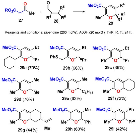 Although the use of cyclic 1,3-dienones has been beneficial for the synthesis and stability of the resulting 2HPs, it is not a mandatory requirement, and acyclic active methylene compounds, such as methyl acetoacetate 27, have been successfully condensed with 2-alkyl-2-enals 28 to deliver the corresponding stable 2,3,6-trisubstituted 2HPs 29 (Scheme 12) [41].