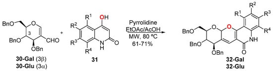 Pyrano[3,2-c]quinolone is a core structural motif in alkaloids and is endowed with important pharmacological and therapeutic activities. As part of a research program aimed at developing efficient synthesis of natural product-like small molecules, a small 23-membered library focused on carbohydrate fused pyrano[3,2-c]quinolone structures 32 was synthesized and subjected to antiproliferative activity studies (Scheme 13) [42]. The library was synthesized using the microwave assisted pyrrolidine-AcOH catalyzed IMKC of formyl galactal (30-Gal) and formyl glucal (30-Glu) with 4-hydroxyquinolones 31, and although the electron donating or electron withdrawing character of groups R1, R2, R3, and R4 of 4-hydroxyquinolones significantly affected neither the yield nor the reaction completion time, the best yields were obtained when unsubstituted 31 was used (70% with 30-Gal and 71% with 30-Glu). The other combinations gave yields ranging from 62 to 69%.
