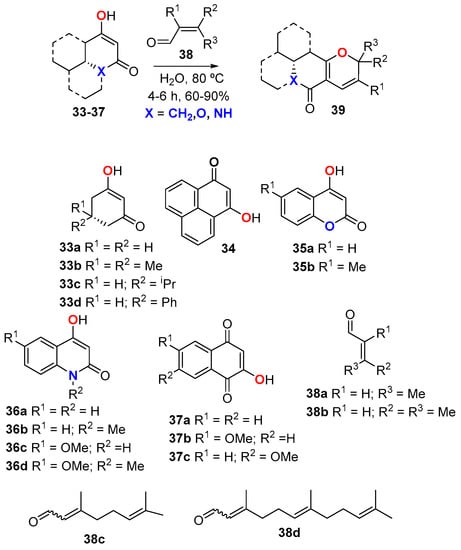 The Knoevenagel/electrocyclization strategy is suitable to be performed in water (Scheme 14) [43]. This methodology was applied to the synthesis of biologically interesting 2HPs of general structure 39, comprising pyranocoumarin, pyranoquinolinone, and pyranonaphthoquinone derivatives along with selected natural and non-natural products (X = CH2, O, NH). The reactions were performed by mixing the 1,3-dicarbonyl compound 33–37 with enal 38 in water at 80 °C for 4–6 h. Although authors did not specify the physical conditions of these reactions, the high hydrophobicity of the reactants suggested that these reactions were carried out as aqueous suspensions (the so-called “on water” conditions [44], rather than as homogeneous solutions. Solvent-free protocols have been also described for the IMKC reaction [45,46].