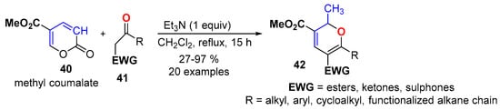 The condensation of methyl coumalate (40) with a wide range of active methylene compounds 41 has been implemented to access an extensive series of 2,3,5,6-tetrasubstituted 2HPs 42 (Scheme 15) [47]. The reaction involved a domino 1,6-Michael/6π-electrocyclic ring opening/[1,5]-H transfer/(decarboxylation)/6π-electrocyclization reaction. The methyl substituent allocated at C2 position of the 2HP ring corresponds to the α-methine group alpha to the lactone in the coumalate ring (highlighted as CH in Scheme 15).