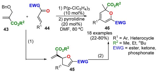 A one pot synthesis of 2,2,4,6-tetrasubstituted 2HPs 46 has been developed using Bayllis–Hillman carbonates 43 and β,γ-unsaturated α-oxo-esters 44 (Scheme 16) [48]. The one-pot reaction involved a phosphine-catalyzed condensation of 43 and 44 to give intermediate 4,5-dihydrofuran 45, which, in the presence of pyrrolidine and heat, rearranged to the 2HP 46. Authors gave a tentative mechanism for this pyrrolidine-catalyzed rearrangement. All the examples incorporated an aromatic (heterocyclic) substituent at R1, but the authors do not explain if this was a mandatory property of this substituent.