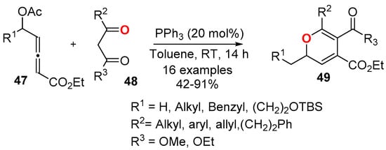 Stable 2,4,5,6-tetrasubstituted 2HPs 49 have been synthesized by the phosphine-catalyzed [3 + 3] annulation of ethyl 5-acetoxypenta-2,3-dienoate 47 and 1,3-dicarbonyl compounds 48 (Scheme 17) [49]. The scope of the reaction was wide, tolerating a good variety of the substituents. The presence of the ester group at the C5 position of the ring was fundamental for the stability of the 2HP 49.