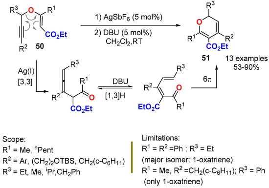 Propargyl vinyl ethers 50 have been successfully rearranged into stable 2,4,5,6-tetrasubstituted 2HPs 51 through a one pot procedure involving a Ag(I)-catalyzed propargyl Claisen rearrangement followed by a tandem DBU-catalyzed isomerization/6π-oxa-electrocyclization reaction (Scheme 18) [50]. The protocol used secondary propargyl vinyl ethers (they bear only one substituent at the propargylic position; R3), and it required the installation of an ester group at the C5 position of the ring and substitution at the C6 position to give stability to the monocyclic 2HP 51.