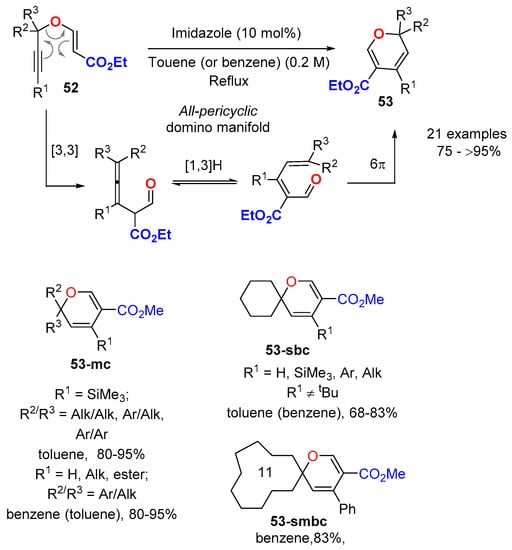 More recently, a metal-free domino strategy has been developed for the synthesis of 2,2,4,5-tetrasubstituted 2HPs 53 from propargyl vinyl esters 52 (Scheme 19) [51,52,53]. The strategy made use of an imidazole-catalyzed all-pericyclic domino manifold entailing a sequential propargyl Claisen rearrangement/[1,3]-H shift/oxa-6π-electrocyclization set of reactions. Again, the presence of an ester functionality at the position C5 of the ring was mandatory to stabilize the final 2HP 53. The double substitution at C2 favored the 2HP formation (steric information) and offered a wide range of optional substitution patterns at the ring (Alk/Alk, Ar/Alk, Ar/Ar). The protocol delivered 2HP structures endowed with different topologies, including monocycles (53-mc), 2,2-spiro-bicycles (53-sbc), and 2,2-spiro-macrobicycles (53-smbc). The main limitation arose from the presence of a tBu substituent at the alkyne position (R1): In this case, the reaction followed a different pathway through a sequential [1,7]-H shift/6π-electrocyclization/MeOH elimination set of reactions [54].