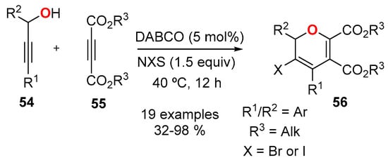 An alternative protocol using propargyl alcohols 54 and alkyl ethylendicarboxylates 55 has been developed (Scheme 20) [24,55]. The protocol generated 2,3,4,5,6-pentasubstituted 2HPs 56, incorporating two identical ester functionalities at C5 and C6, and a halogen atom at C3. The protocol used DABCO as the catalyst and N-iodosuccinimide (NIS) or N-bromosuccinimide (NBS) as the halogenation agent to generate 2HPs 56 in moderate to good yields. In all the conditions explored in Scheme 20, the substituents at the propargyl alcohol were aromatics (R1/R2 = Ar). The authors did not specify if this was a limitation to the procedure, or was just an inconvenient choice of starting materials.