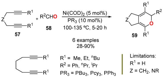 The Ni(0)-catalyzed cycloaddition of diynes 57 and aldehydes 58 has been explored in the construction of bicyclic 2HPs 59 (Scheme 21) [26,56]. Authors found that the structure of the diyne 57, mainly the substitution at the terminal positions (R1 ≠ H), and the length of the chain connecting the alkyne units, exerted a great influence on the bicyclic 2HP formation reaction. The worst yield was observed when acetaldehyde was used as the aldehyde (28%), whereas the best was observed with n-butanal (90%).