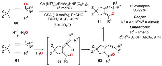 A transition metal-free, cycloisomerization of diynols 60 to generate bicyclic 2HPs 61 has been reported (Scheme 22) [26]. The reaction was catalyzed by a cooperative catalytic system entailing Ca2+ catalyst (5 mol%) and camphorsulphonic acid (10 mol%), in the presence of benzaldehyde as a mild Lewis basic electron donor. The reaction was carried out without exclusion of air and moisture, and it tolerated a wide range of functionalities on the electron rich 2HP ring. The main limitations arose from substituents R2/R3 at the propargylic terminal position, which only allowed the alkyl/alkyl combination, and from R1, which had to be aromatic. The only limitation for the aromatic substituent at R1 was the presence of a free hydroxyl group at the ortho position of the ring. As long these restrictions were kept, excellent yields of 2HPs were obtained. The mechanistic proposal involved the formation of a propargylic tertiary cation 61, which afforded the cyclic 1-oxa-2,4,5-triene intermediate 62, which isomerized to 63 and rearranged into 2HP 64.