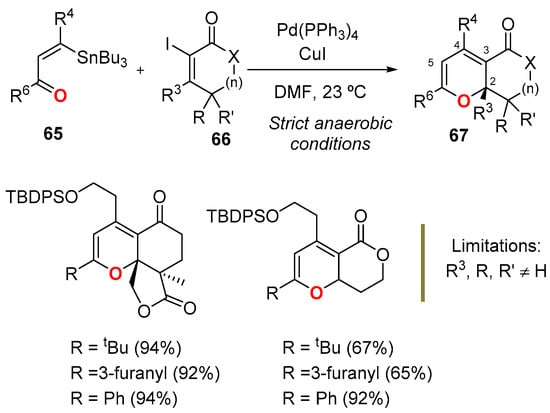 Highly substituted bicyclic 2HPs 67 have been synthesized by a palladium-catalyzed tandem Stille-oxa-electrocyclization reaction between vinyl stannanes 65 and vinyl iodides 66 (Scheme 23) [57,58]. The strategy was a convergent alternative to the known methods for constructing similar bicyclic 2HPs, and it has been used in the total synthesis of natural products [59,60,61]. Although it required the prior stereoselective construction of both vinyl derivatives, the strategy had several advantages: It was convergent, highly diastereoselective, and required mild reaction conditions with low catalyst loadings (5 mol%). In the pattern of construction depicted in Scheme 23, the main restriction came from the nature of the vinyl iodide 66, which had to have substituents at the vinyl (R3 ≠ H) and allylic positions (R/R’ ≠ H) to stabilize the 2HP ring form by steric destabilization of the 1-oxatriene form.