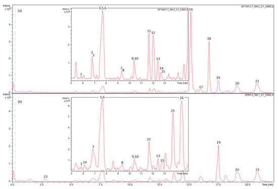 The base peak chromatograms (BPC) of methanolic extract of (a) Salvia fruticosa and (b) Salvia pomifera.