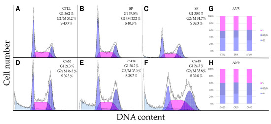 Cell cycle analysis of A375 cells. (A) Control DMSO treated cells. Cells treated 24 h with 100 μg/mL of (B) SP, (C) SF methanolic extracts or (D–F) CA at concentrations of 20, 30 and 40 μg/mL. (G,H) SF extract and to a larger extent CA significantly increased the proportion of A375 cells in G2/M phase.