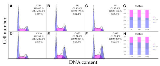 Cell cycle analysis of Mel JuSo cells. (A) Control DMSO treated cells. Cells treated 24 h with 100 μg/mL of (B) SP, (C) SF methanolic extracts or (D–F) CA at concentrations of 20, 30 and 40 μg/mL. (G,H) CA at concentrations 30 and 40 μg/mL significantly increased the proportion of Mel JuSo cells in G2/M phase.