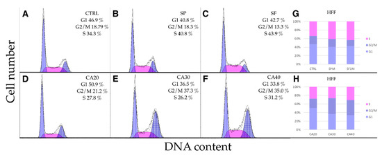 Cell cycle analysis of HFF cells. (A) Control DMSO treated cells. Cells treated 24 h with 100 μg/mL of (B) SP, (C) SF methanolic extracts or (D–F) CA at concentrations of 20, 30 and 40 μg/mL. (G,H) CA at concentrations 30 and 40 μg/mL significantly increased the proportion of HFF cells in G2/M phase.