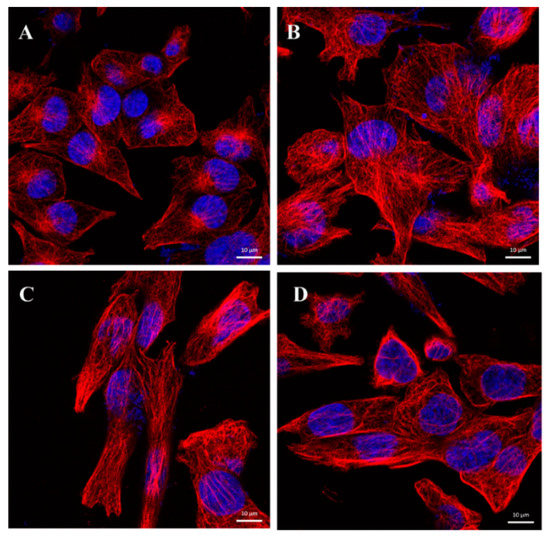 The observed accumulation of cells in the G2/M phase of the cell cycle upon CA treatment is a typical feature of microtubule disruption. Therefore, we used indirect immunofluorescence to study the morphology of microtubules. Since the effect on cell cycle arrest was more pronounced in A375 cells treated with CA, we studied microtubule morphology after 24 h treatment of A375 cells with CA at concentrations 20, 30 and 40 μg/mL. Control cells showed a regular network of cytoplasmic microtubules (Figure 9A). Incubation of A375 cells with CA led to morphological changes of microtubules, which formed thick bundles resembling response to MT-stabilizing drugs such as taxanes (Figure 9B–D). The cells were enlarged with large nuclei. It is probable that this microtubule disorganization is the cause of the above-mentioned accumulation of cells at the G2/M phase.