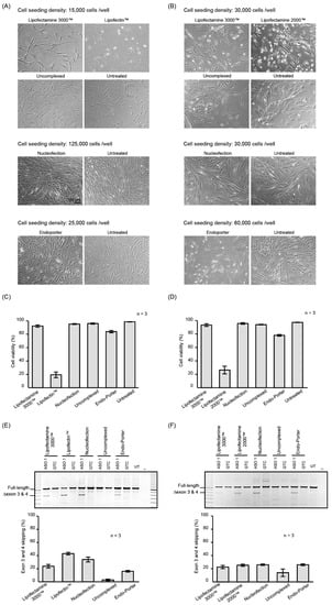 The first compound to be granted accelerated approval for the treatment of Duchenne muscular dystrophy, Exondys 51, was developed in our laboratory [24,25,26], and we are currently researching nucleic acid therapeutics for numerous diseases amendable to RNA splicing intervention [24,25,27,28,29]. Consequently, we have experience in the design, delivery and evaluation of hundreds of PMOs in different cell lines to address various mutations. We found that PMOs can be delivered into adherent cells, without a leash, using commercially available cationic lipid-mediated transfection reagents, with an efficiency similar to that observed with nucleofection. Cationic lipid transfection reagents were chosen due to the ease of accessibility to most laboratories throughout the world. In addition, little literature exists regarding alternative transfection methods. Of the transfection reagents evaluated, we found that Lipofectamine 3000™ had the least impact on cell morphology and viability but offered relatively effective PMO delivery into fibroblasts. In addition to Lipofectamine 3000™, Lipofectamine 2000™ also offered effective PMO delivery into cultured myoblasts/myotubes. Nucleofector or Neon electroporator instruments and their consumables are relatively costly; however, the advantage of these delivery systems is that the PMO can be delivered to as many as 20 or 6 million cells, respectively, using substantially lower amounts of PMO. Consequently, we routinely use nucleofection for PMO delivery, and we report optimised PMO delivery programs using the P3 Primary Cell 4D-Nucleofector™ X Kit (Lonza) that can be used for various cell lines.