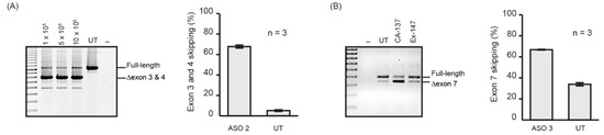 (A) RT-PCR products of ITGA4 transcript amplified from human fibroblasts nucleofected with ASO 2 at 50 µM concentration in the cuvette using the P3 nucleofection kit and CA-137 program and various cell densities. The number of cells nucleofected is shown above the gel. Shown are the average percentages of exon skipping from three biological replicates represented as a bar graph next to the gel image. UT: Untreated. Error bar; SEM. (B) RT-PCR products of SMN transcript from Huh7 cells nucleofected with ASO 3 at 50 µM concentration in the cuvette using P3 kit, and CA-137 or Ex-147 program. Shown are the average percentages of exon skipping using CA-137 program from three biological replicates represented as a bar graph next to the gel image. UT: Untreated. Error bar; SEM.