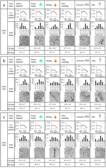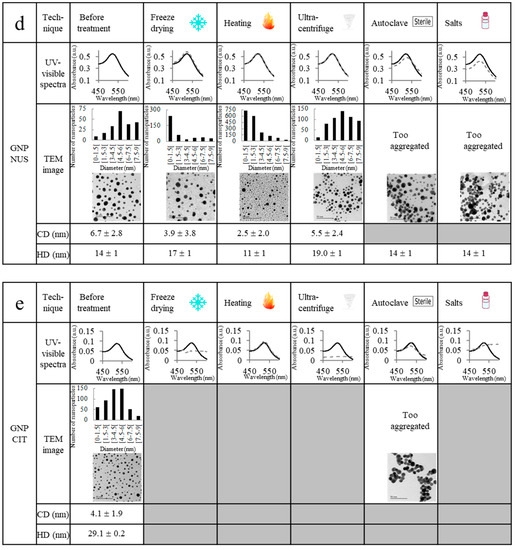 While very small variations can be observed for GNP 800 and GNP 2000 after heating, freeze drying or autoclaving, GNP 6000 is very resistant to any condition. We hypothesize that longer PEG groups reduce the access to the core of the nanoparticles and better stabilize GNP than shorter PEG groups. The size distribution analysis, extracted from TEM images using the ImageJ software, allowed us to determine the core size area, and thus the core diameter (Figure 1). The mean core of ultrastable GNP diameter does not significantly vary after each treatment. DLS experiments led to quite similar results after all treatments, and presented no signs of aggregation. The plasmon bands observed in UV-visible spectroscopy also remain similar (see Table S1 for wavelength and absorbance values). Indeed, variations of ±1 nm for the wavelength and ±0.02 a.u. for the absorbance are observed, that are inferior to the resolution of the spectrophotometer. Only autoclave sterilization leads to a slight shift of the wavelength to 520 nm for the three types, but no drastic change was observed for core and hydrodynamic diameters, as was the case for GNP NUS and GNP CIT. For these latter, UV-visible spectra, TEM images and DLS measurements were obtained according to the same methodology. Results are presented in Figure 1d,e, respectively. For GNP NUS, the UV-visible spectrum is not affected by the ultracentrifugation treatment. This is confirmed by TEM experiments as the core diameter remains similar (6.7 ± 2.8 nm before and 5.5 ± 2.4 nm after ultracentrifugation). However, the hydrodynamic diameter seems amplified after treatment, because of their low stability towards this treatment. While the UV-visible spectra remain stable after the heating treatment, both TEM and DLS revealed a significant reduction of the GNP core and hydrodynamic diameters, suggesting a reorganization of these GNP during the treatment. GNP NUS instability is confirmed by the UV-visible spectra, TEM images and DLS after freeze drying, autoclaving and salts treatments, where an increase of 7% and a decrease of 11% and 20% are respectively observed for the absorbance values of their plasmon bands (see Table S1). As the GNP NUS plasmon band is still observable in each case, we conclude that such treatments do not lead to their aggregation but to a reorganization into GNPs with different properties. Furthermore, GNP CIT were found to be unstable after every treatment (Figure 1e). In most cases, their plasmon band was highly modified or missing. Indeed, the absence of the plasmon band occurs when GNPs aggregate and no longer absorb light at around 515 nm, rendering further analysis such as TEM and DLS impossible. While the plasmon band of GNP CIT does not seem to be affected by the heating treatment, DLS and TEM analyses could not be conducted due to very polydispersed GNP size distribution caused by GNP aggregation. By comparison, GNP NUS and GNP CIT do not remain intact after the same treatments as those applied to our new ultrastable GNP.