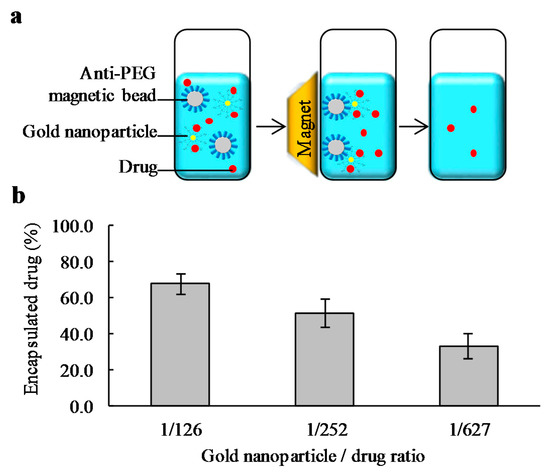 (a) Protocol for the separation of encapsulated drugs from free drugs that uses anti-PEG magnetic beads. (b) Relative levels of drug (bimatoprost) encapsulated by GNP 2000 when GNP/drug ratios of 1/126, 1/252 and 1/627 are used.