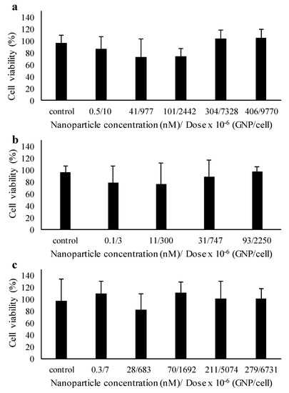 In order to determine the range of concentrations for which ultrastable GNPs are safe for the cells, a MTS assay was performed according to a protocol previously published [39]. The cell viability obtained for each concentration of GNP, according to the GNP type, is detailed in Figure 3. Each band corresponds to the average value obtained for three different populations of hCECs. The data suggest that none of the three types of GNP significantly reduces cell viability upon exposure for 18 h, at all tested doses.