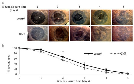 Wound healing assays were adapted from the procedure described by Couture et al. [39]. hCECs from the limbal area of a 71-year old donor were used. All cells were grown under 8% CO2 at 37 °C and culture medium was changed every 2 days. Human Tissue Engineered Corneas (hTEC) were produced following the self-assembly approach. Briefly, corneal fibroblasts were seeded and cultured in a fibroblast growth medium, and prompted to lay down their own ECM by the addition of 50 µg.mL−1 ascorbic acid (Sigma, Oakville, ON, Canada) for 35 days. Reconstructed stromas were produced by the superposition of two tissue sheets. A supplementary week of culture allowed their adhesion to each other. hCECs were then seeded on the surface of the reconstructed stroma and cultured in submerged conditions in complete epithelial cell medium supplemented with ascorbate. After 7 days, reconstructed tissues were fed with an EGF-free epithelial cell medium and raised at the air–liquid interface for 7 days to induce epithelial differentiation. hTECs were then wounded using an 8-mm biopsy punch. A reconstructed stroma made of two more fibroblast sheets was then fixed under the wounded hTECs to allow reepithelialisation to occur. hTECs were fed fresh culture medium every 2 days underneath the fibroblast sheets so that the upper face of the epithelium remained dry. A 50 µL drop of 88 nM of GNP 2000 was added daily to hTECs (directly on the wounded area, on the side facing the air). The specific concentration selected for GNPs was based on the MTS assay results conducted on hCECs. Wound closure was observed macroscopically every 24 h for 5 days and photographed daily with a Zeiss Imager Z2 microscope (Zeiss Canada Ltd., North York, ON, Canada). All experiments were conducted in quadruplicate.