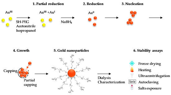 Gold nanoparticles (GNPs) are known as highly tunable materials and are studied in various research fields such as nanomedicine [1,2,3,4,5,6,7,8,9]. However, in many instances, GNP instability restricts their use in this specific field. As an example, the weak stability against physiological buffering salts excludes the use of many GNP types for biomedical applications, since blood is a highly ionic media [10]. In recent decades, intensive research has been undertaken to develop new synthesis leading to ultrastable GNP. An exhaustive review of highly-stable and ultrastable GNPs led to only a dozen publications describing new synthesis conditions and resistance against different criteria [11,12,13,14,15,16,17,18,19,20,21,22]. However, most of the time, GNPs presented ultrastable properties only under limited conditions and were not water-soluble. Indeed, there is no precise definition of what should be called ultrastable, and this term can be misused. For instance, numerous GNPs have been reported to be stable for more than six months at room temperature without any alteration [18,23], but this feature should not be sufficient to define them as ultrastable [12,16,20]. The notion of time must be taken into account and the stability kinetics explained when the aggregation is observed after a few minutes following salt exposure [11,13,16,17,19,20]. Nonetheless, some studies have suggested a degree of stability against freeze drying, salts resistance [11,13,15,16,17] and/or autoclaving [24]. A broader overview of GNP characteristics is preferable for medical applications. Moreover, none of the aforementioned GNPs maintained their stable properties after sterilization by autoclaving in an aqueous buffer. In this study, we propose defining the term “ultrastable” in this context as being GNPs whose characteristics (plasmon band, hydrodynamic diameter, and core diameter) are not modified under drastic conditions, such as freeze drying, heating, ultracentrifugation, solubilization in ionic media, as well as autoclave sterilization.